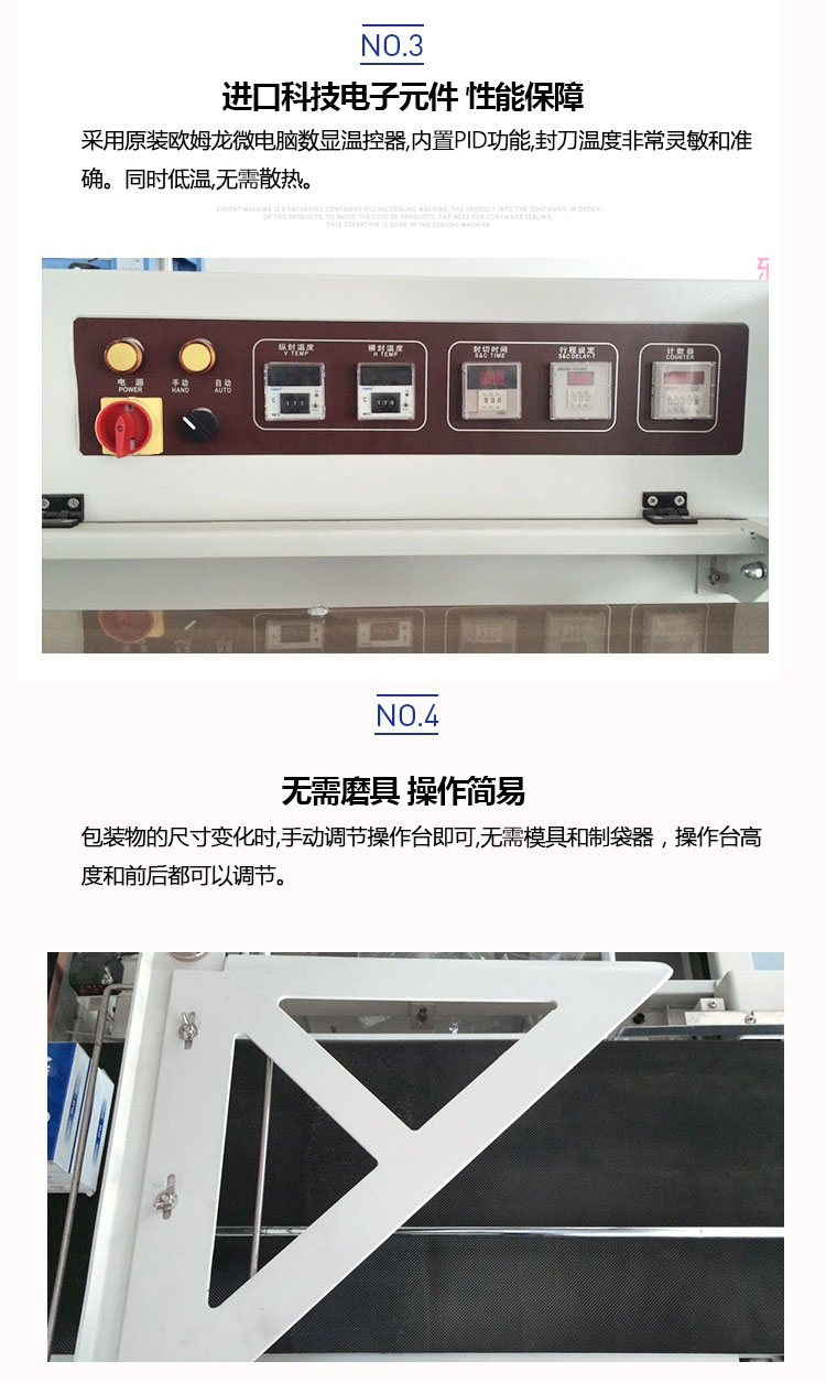 采用國際先進(jìn)控制元件;封刀采用特殊設(shè)計(jì),封口牢固、不開裂、不粘刀;